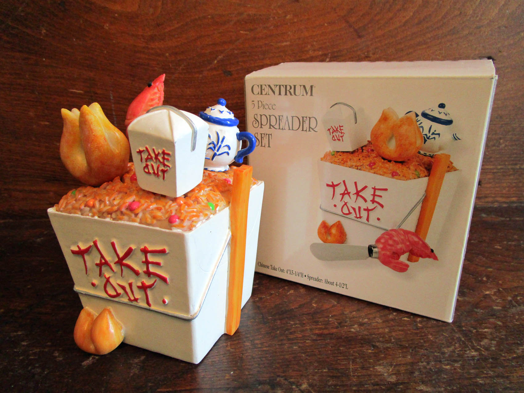 And some of the most fun sets are spreader house sets: a holder and usually four spreaders in one theme. This Chinese Take Out spreader house set is quite clever….